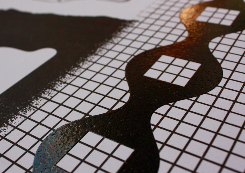 Thermography is a process we use in conjunction with Risograph printing. Printing with any Riso colour, we apply a fine resin powder to the wet ink and send the print through a heat tunnel which melts the powder creating a raised effect.