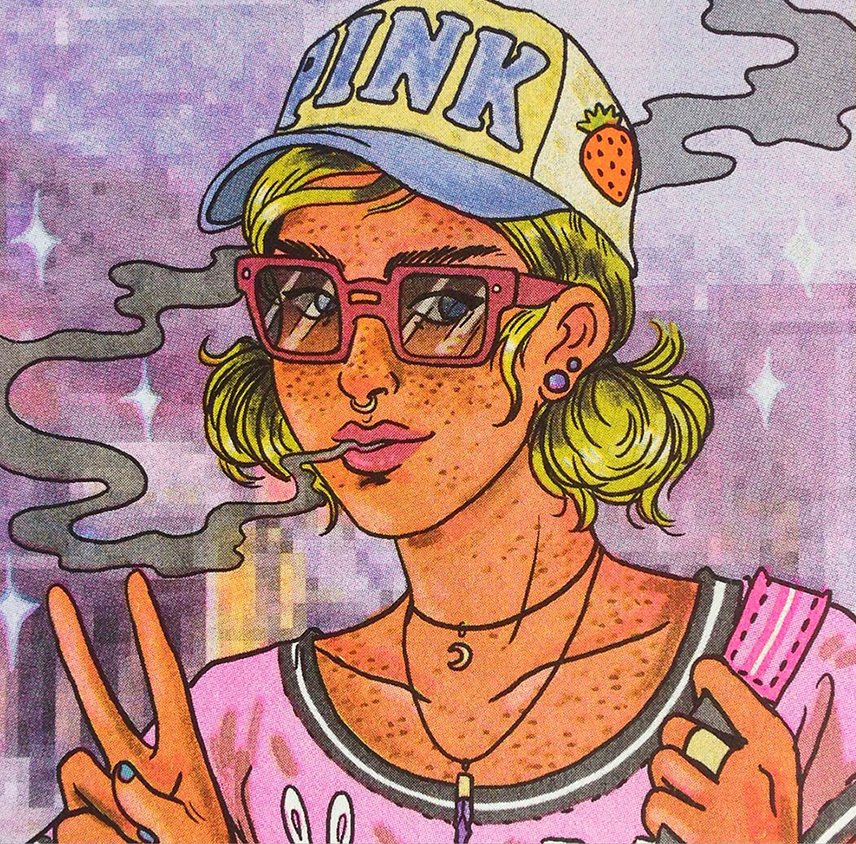 20 pages of Risograph faux cmyk, printed with Cornflower Blue for Cyan, Fluorescent PInk for Magenta, Yellow and Black. First printing, edition of 50. Second printing edition of 25.