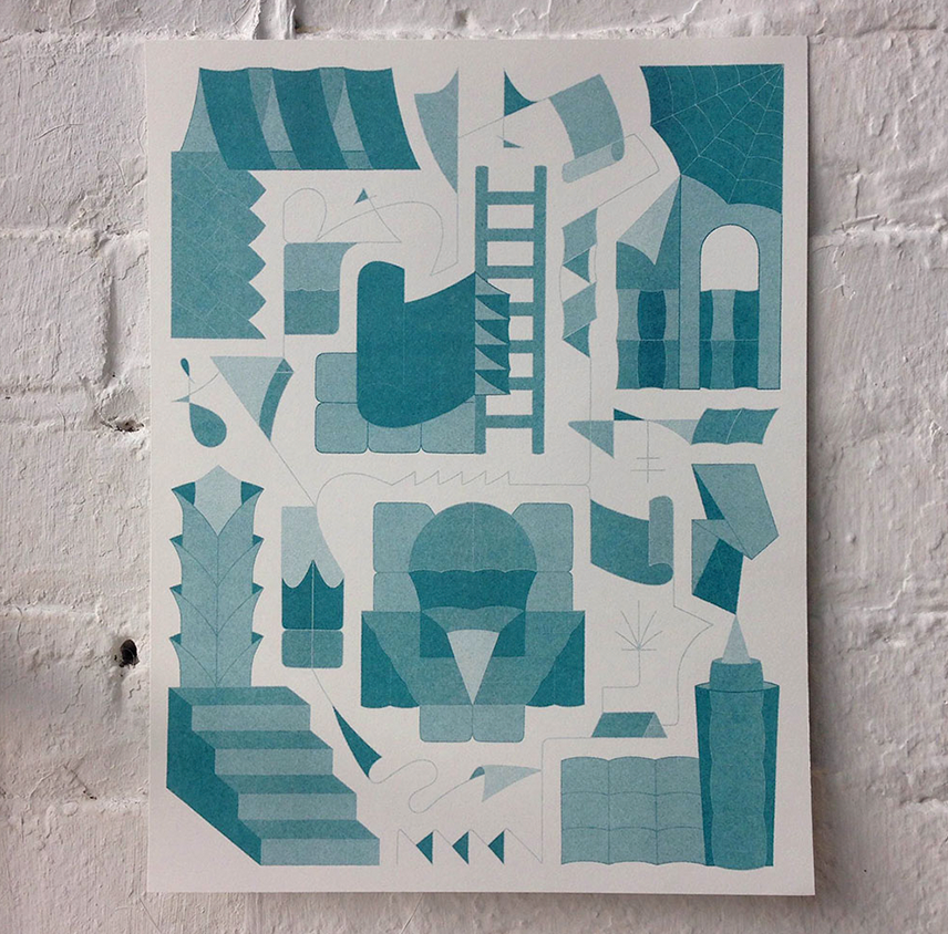 4 colour Risograph print on 80# text weight Via Vellum 'Pure White.' Printed in faux cmyk using the Riso's Mint Green for Cyan, Fluorescent Pink for Magenta, Yellow and Black. Edition of 50.